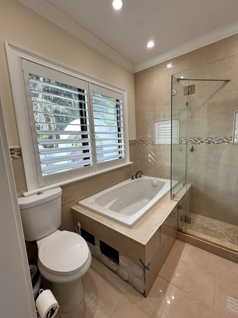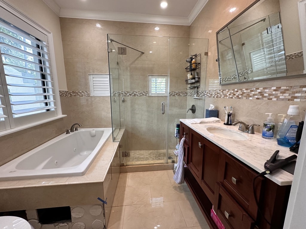 Master bathroom delicately tailor made, with a flair of Miami Beach Cottage.
